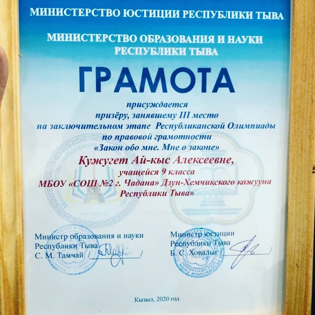 Наша Ай-Кыс Кужугет, умничка и красавица 9 «А» класса МБОУ «СОШ 2 г. Чадан стала призёром заключительного этапа Республиканской олимпиады по правовой грамотности » Закон обо мне. Мне о законе». Награждена Грамотой Министра образования и науки РТ С.М Тамчай и министра юстиции РТ Б.С. Ховалыг. Помимо этого в награду получила Сертификат на Всероссийский детский центр «Океан». Мы гордимся тобою, Ай-Кыс! Успехов тебе и процветания! Учитель, подготовивший призёра, Куулар А.В.👍👏👏👏
