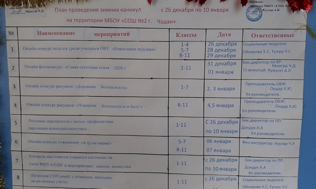 Без рубрики План проведения мероприятий зимних каникул с 26 декабря по 10 января на территории МБОУ «СОШ №2 г. Чадан» /