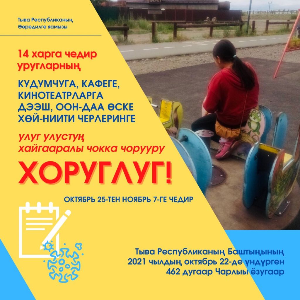 2021 чылдың октябрь 25-тен ноябрь 7-ге чедир Тыва Республиканың Баштыңының 2021 чылдың октябрь 22-де үндүрген 462 дугаар Чарлыы ёзугаар, кудумчуга, кафеге, кинотеатрларгатрларга дээш оон-даа өске хөй-ниити черлеринге улуг улустуң хайгааралы чокка 14 харга чедир уругларның чорууру хоруглуг!