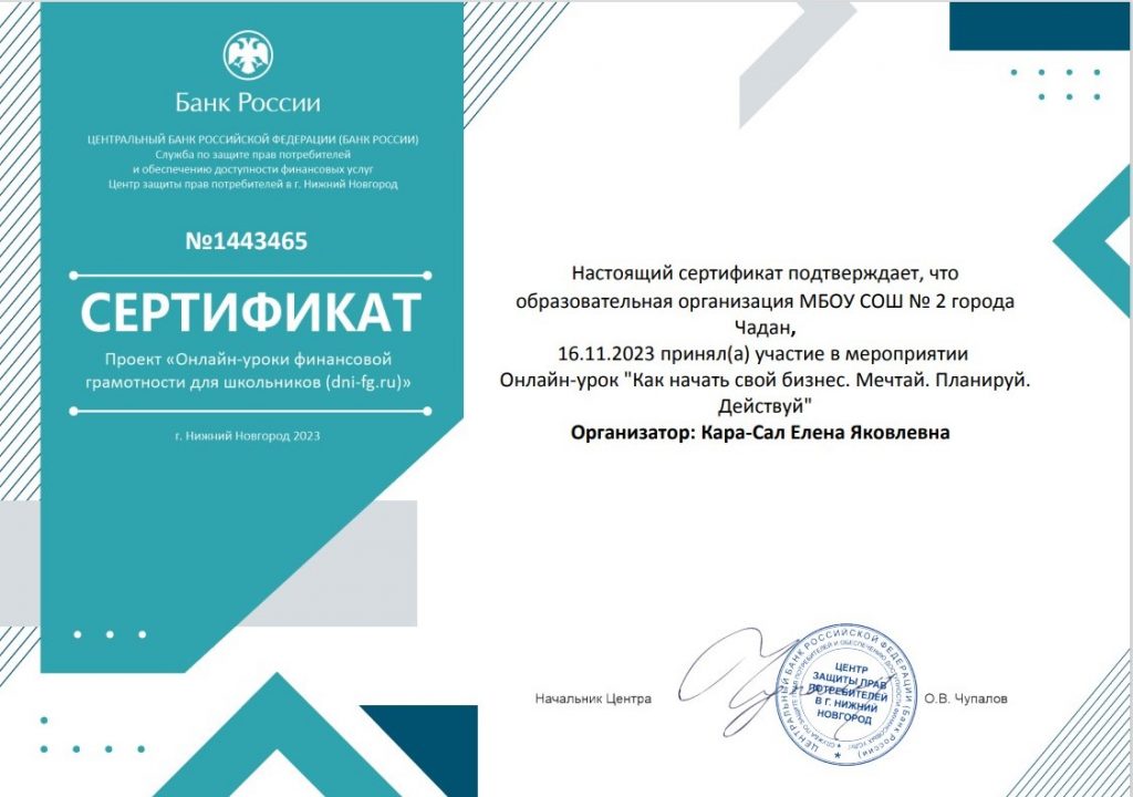 Обучающиеся приняли участие в цикле вебинаров «Онлайн-уроки финансовой грамотности». Организатор – Центральный банк Российской Федерации в лице Управления Службы по защите прав потребителей и обеспечению доступности финансовых услуг в Приволжском федеральном округе. Сайт https://www.dni-fg.ru. Вебинары по темам: «Платить и зарабатывать банковской картой?», «Знай свои деньги», «Как начать свой бизнес. Мечтай. Планируй. Действуй».