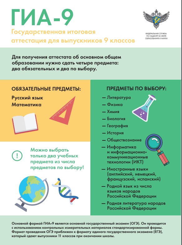 ГИА в форме ОГЭ и (или) ГВЭ включает в себя четыре экзамена по следующим предметам: экзамены по русскому языку и математике (далее – обязательные учебные предметы), а также экзамены по выбору обучающегося, экстерна (далее вместе – участники ГИА) по двум учебным предметам из числа учебных предметов, названных в Порядке проведения ГИА по образовательным программам основного общего образования: физика, химия, биология, литература, география, история, обществознание, иностранные языки (английский, французский, немецкий и испанский языки), информатика и информационно-коммуникационные технологии (ИКТ).